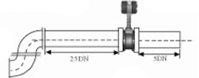 5、不同平面兩個彎管的安裝 如果流量計的前端有兩個90°彎頭,要保證流量計的前直管段≥25D,后直管段≥5D |